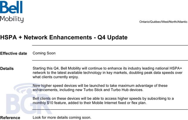 BGR has posted a leaked memo reporting Bell Canada will be charging customers a $10 per month premium to use their “fast” HSPA+ network. The memo is not clear as to which devices will be affected, but it seems likely to also include newer smartphones as well as the USB internet “turbo sticks”.