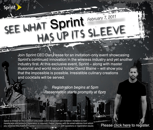 Sprint has emailed invitations to members of the Press, inviting them to a media event next month. Sprint will be announcing an industry first, and David Blaine will also be on hand for this special event, taking place in New York City. Hopefully David Blaine can make some numbers disappear off the bill for data charges!