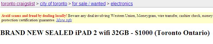 And then we have Kijiji also showing similar high pricing. The 32GB WiFi iPad 2 retails for $599 US or $588 CDN based on today’s exchange rate.