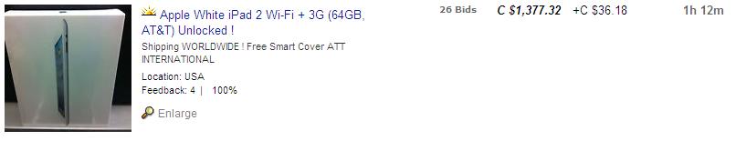 And last, we have Ebay with extremely high pricing with the 64GB 3G Tablet selling for $829USD or $814 CDN based on the current exchange rate. What is scary about this is the fact there are 26 bids for the iPad with such high pricing. It would appear some people are willing to pay any price to have the latest and greatest.
