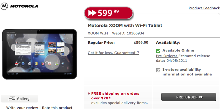 Futureshop has revealed a Motorola Xoom WiFi model pre-order page and has the dual core tablet coming April 8 at a price of $599.99. The much anticipated tablet boasts a dual core processor and a whopping 1GB of RAM. The Motorola Xoom also features Android Honeycomb 3.0 and comes with 32GB of internal memory.