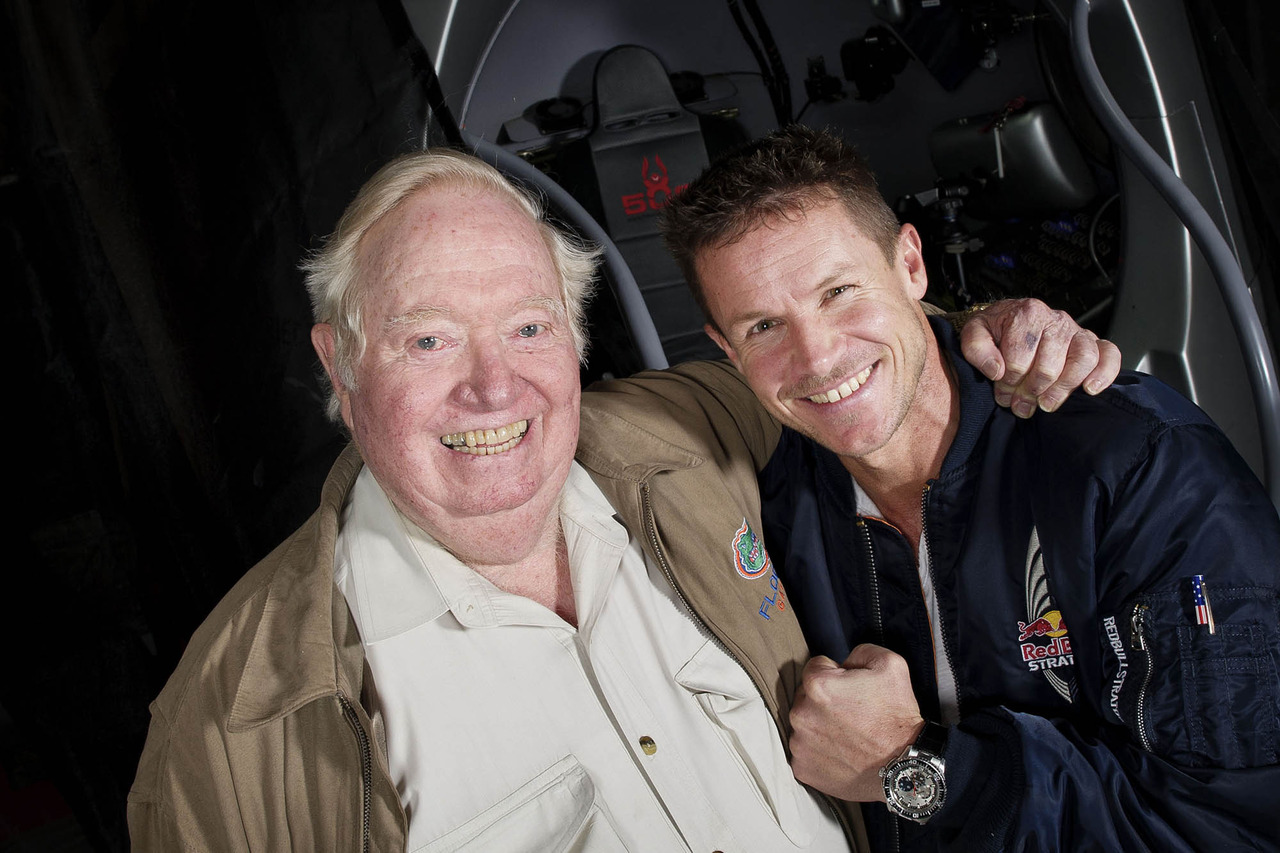 USAF colonel (ret.) Joe Kittinger of the United States and pilot Felix Baumgartner of Austria seen during the presentation of the capsule for Red Bull Stratos, a mission to the edge of space to break the speed of sound in freefall in Lancaster, California, USA on February 23 2012.