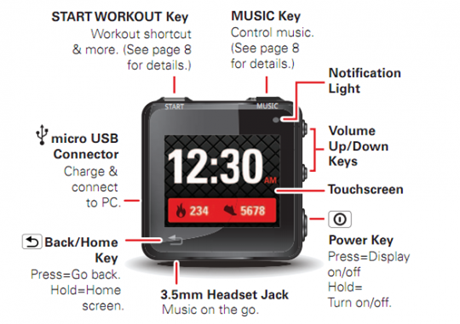 The Motorola MotoActv has a 1.6″ touchscreen display that is as responsive as most smartphone touchscreen for interaction. Its physical dimenstion is listed as 46 X 46 X 9.6 mm and weighs in at 35 g. The screen is made of Corning’s Gorilla Glass 1 and the straps and overall build of the device is made to be sweat\water proof. Around the devices you will find the power button and the volume +/- buttons on the right side, while there are dedicated buttons for “Music” (stop\play) and “Start” (Stop\Start) when using the timer. For connectivity, it has ANT+ enabled, Bluetooth 1.2 profile, microUSB, WiFi for syncing your workout progress on Motorola’s server called “Training Portal”, and of course the 3.5 mm headphone jack located along the bottom of the device.