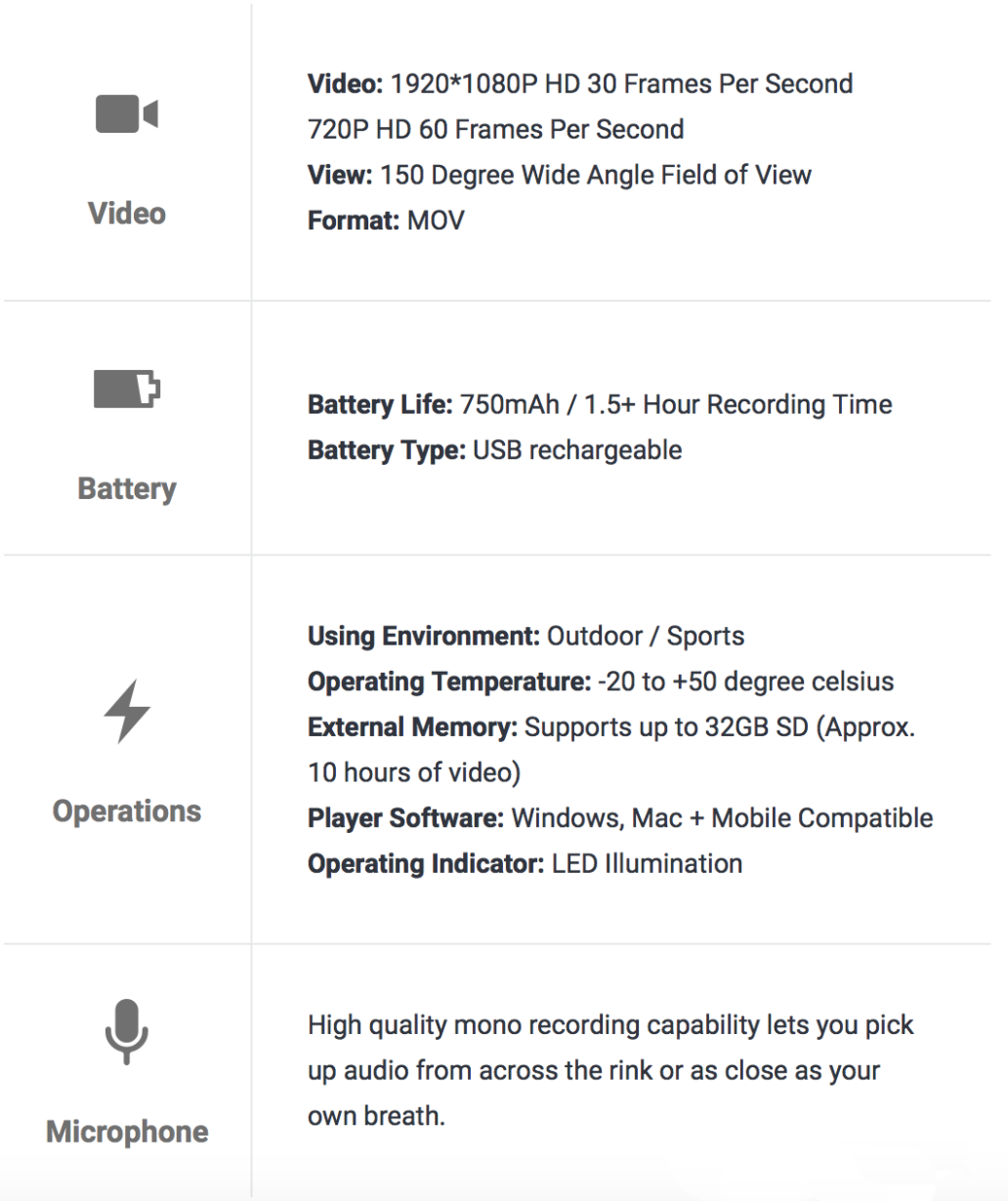 Uhwk records in 720P or 1080P and can you can access the .mov video file easily via MicroSD memory card. Fully charged you can expect about 1.5 hours of battery life and the camera is charged via microUSB.